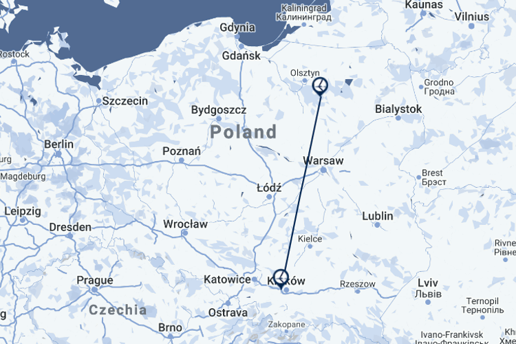 Loty na trasie Olsztyn Mazury (SZY) - Kraków Balice (KRK) wykonywane będą od 20 czerwca 2020 roku. Trasa obsługiwana będzie trzy razy w tygodniu - w poniedziałki, środy i piątki . Lot trwać będzie 1 godz. i 5 minut. Na trasie operować będzie odrzutowy samolot pasażerski Embraer 175. Bilety lotnicze kosztują od 99 zł w jedną stronę bez bagażu. | ||||||||||